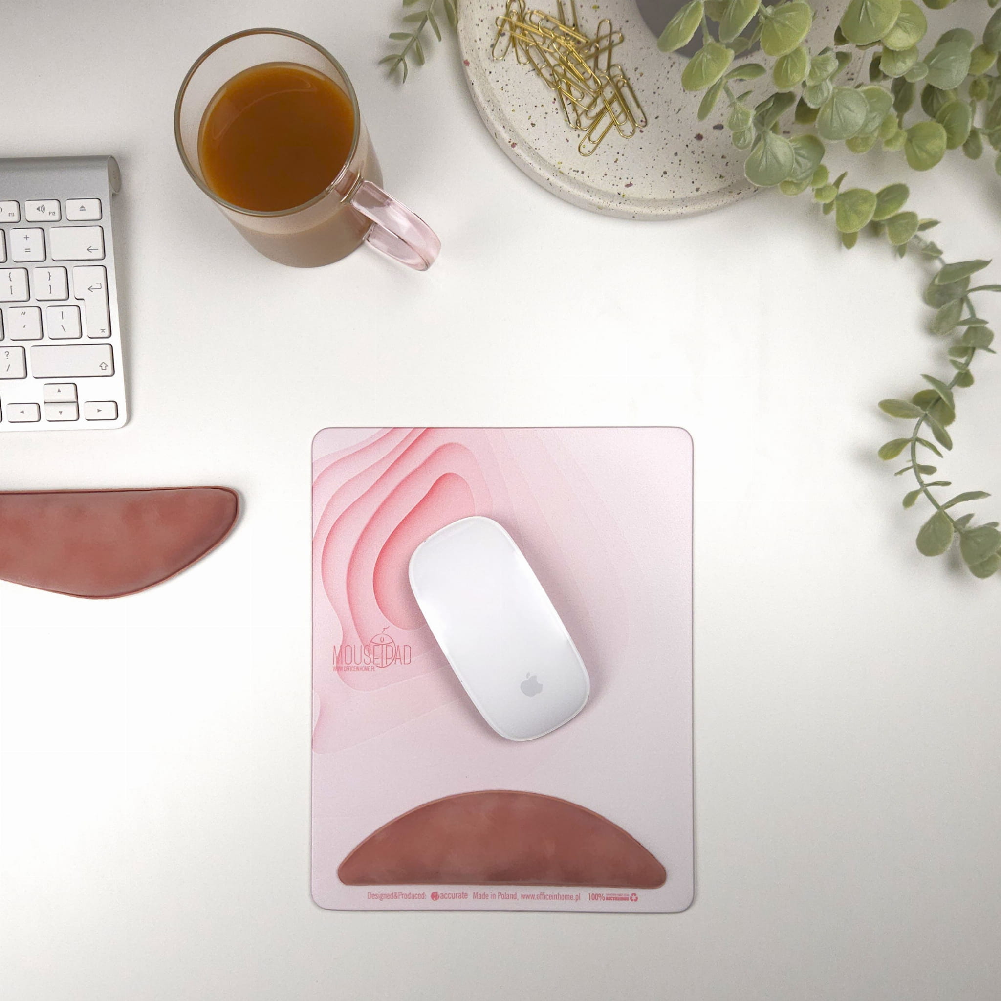 - Kształt podkładki pozwala na swobodne poruszanie myszką na całym obszarze zakresu ruchu ręki podczas pracy przy komputerze oraz dzięki prostej formie podkładka nie zajmuje dużo miejsca na biurku